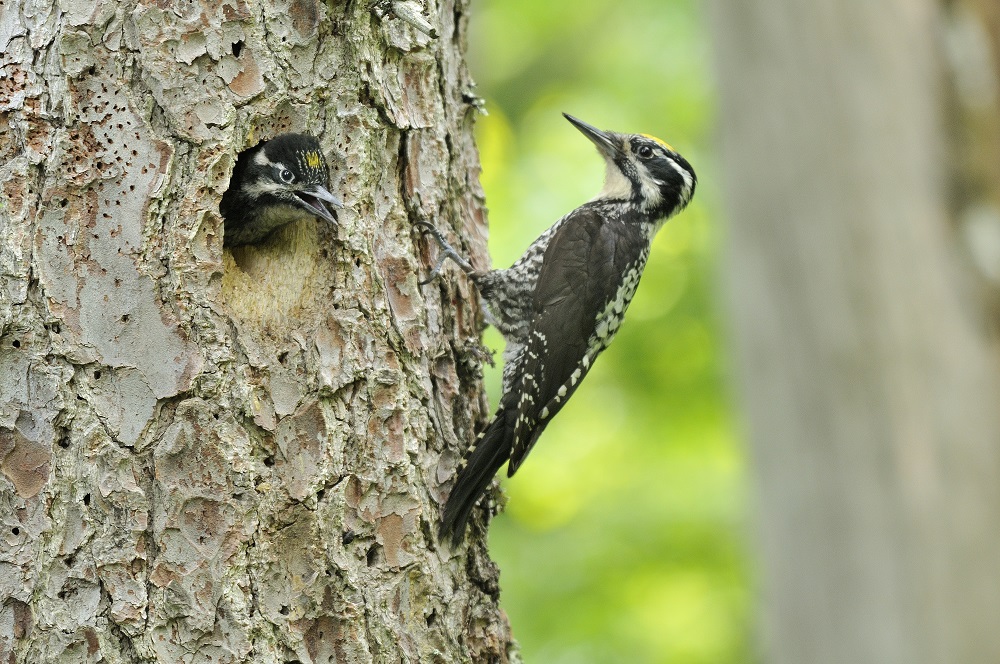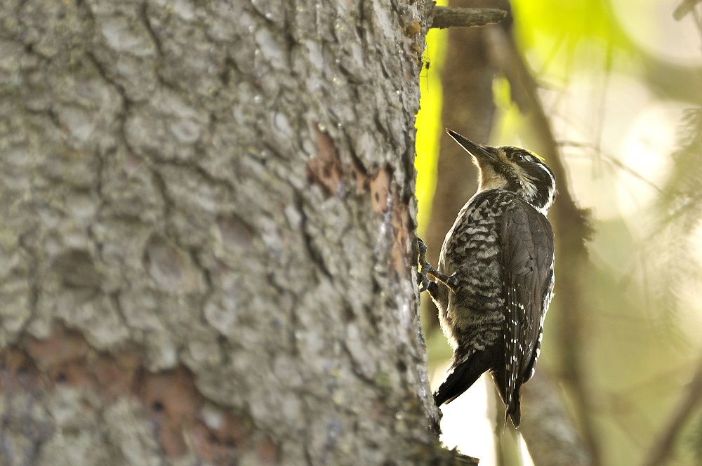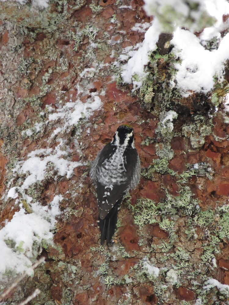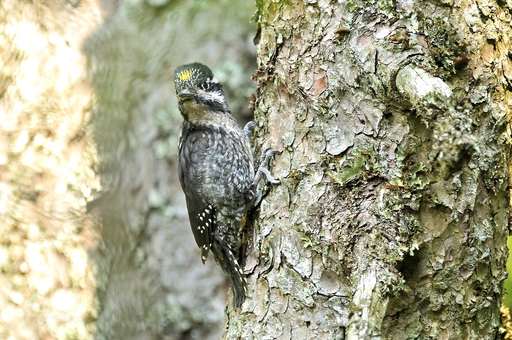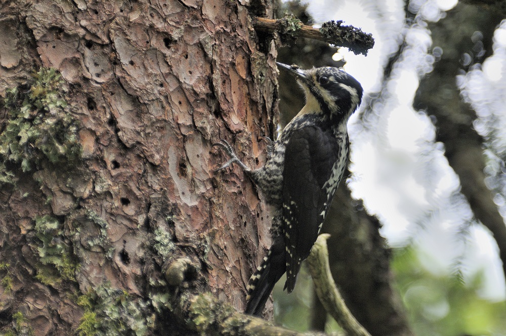 Quasiment de ma même taille que le pic épeiche, le pic tridactyle présente un aspect plus sombre, en raison de ses ailes toutes noires et de ses flancs diffusément barrés de gris. La tête également parait foncée avec un large masque noire. Seule une bande blanche sur le dos éclaircie quelque peu son plumage. Le mâle se distingue de la femelle par le dessus de sa tête (calotte) teintée de jaune doré. L'espèce est sédentaire et niche dans les vieilles forêts de conifères ou mixtes, riches en bois mort, principalement au nord du 50 ème parallèle. En France l'espèce est très rare et n'est connue que dans la massif jurassien et le nord des Alpes.